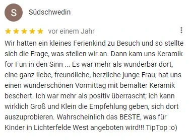 Auch für kleine Künstler haben wir spezielle Angebote im Sortiment. Perfekt für Kunstliebhaber aller Altersgruppen. Ganz gleich, ob du alleine, zu zweit oder in Gruppen kommst. Komm vorbei und erlebe den Spaß und die Freude, selbst Keramik zu bemalen! Deine kreative Reise wartet auf dich bei Keramik for Fun in Berlin.