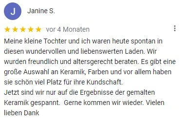 Nach nur wenigen Tagen ist dein persönliches Keramikmeisterwerk bereit zur Abholung. Erlebe die Freude, dein eigenes, handbemaltes Stück Keramik in den Händen zu halten! Dein fertiges Keramikstück ist nun spülmaschinenfest, aber achte darauf, es nicht in die Mikrowelle zu stellen!